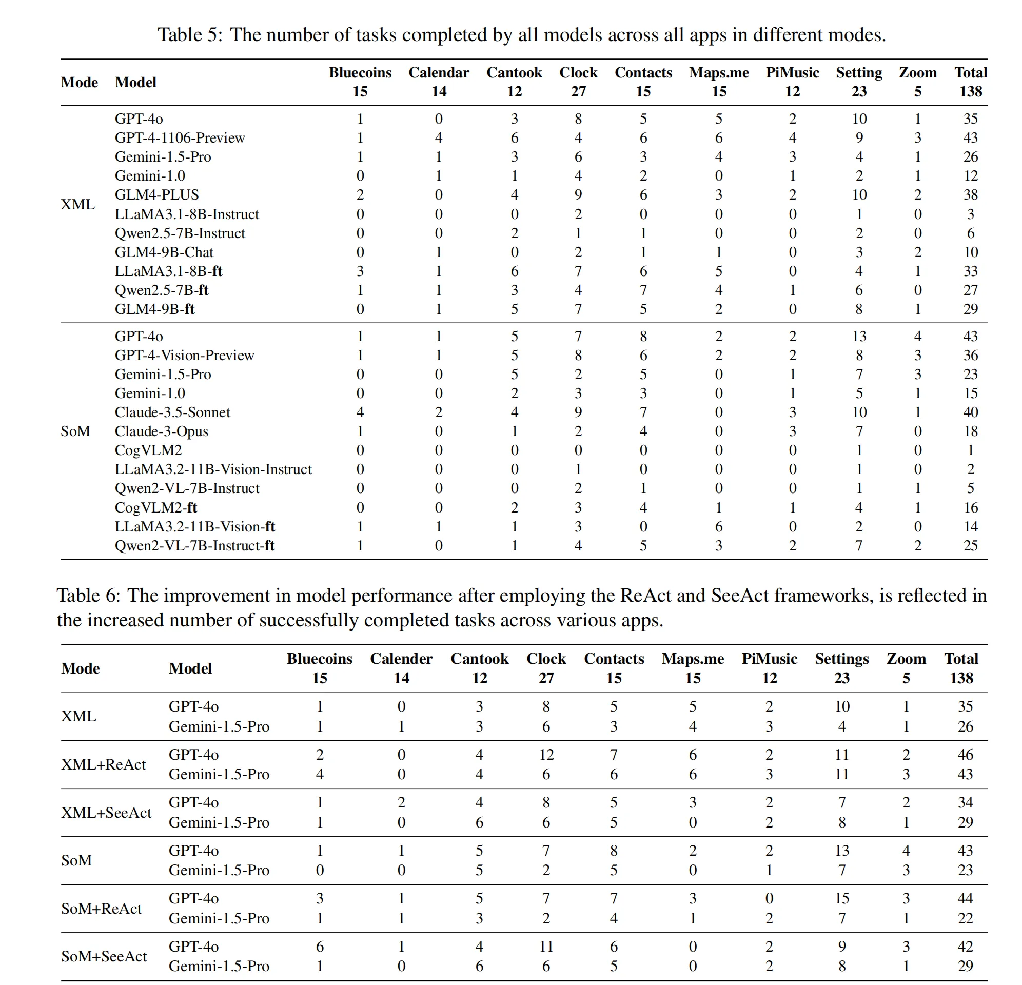 表5展示了不同模型在各个APP中正确完成的任务数量,没有使用ReAct和SeeAct框架。结果显示,GPT-4o和GPT-4-1106-Preview表现较好,分别完成了78个和79个任务。在XML模式下,GPT-4-1106-Preview表现突出,完成了43个任务。而在SoM模式中,GPT-4o表现最佳,完成的任务数量远高于其他模型。大多数模型在“联系人”和“设置”等任务中的成功率较高。总体来说,GPT-4o和GPT-4-1106-Preview在XML和SoM模式下显著优于其他模型,而Gemini-1.5-Pro在多个APP中完成了合理数量的任务。