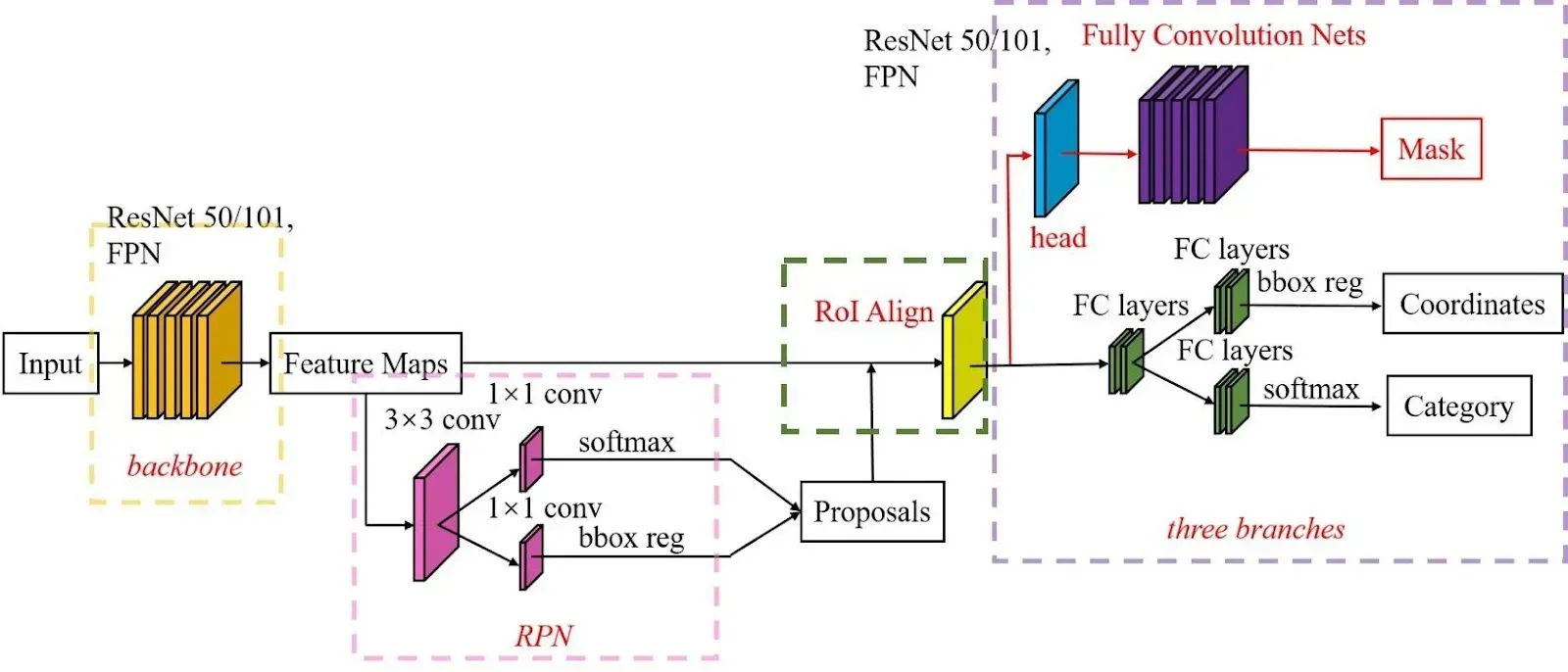 Mask R-CNN 增加了一个额外的分支,用于生成每个目标的像素级掩码。对于每个候选区域,掩码分支会输出一个 K×m×m 的张量,其中 K 是类别数,m×m 是掩码的分辨率。掩码损失通常使用逐像素的二值交叉熵损失(Binary Cross-Entropy Loss)来计算,且只针对真实类别对应的掩码进行监督。